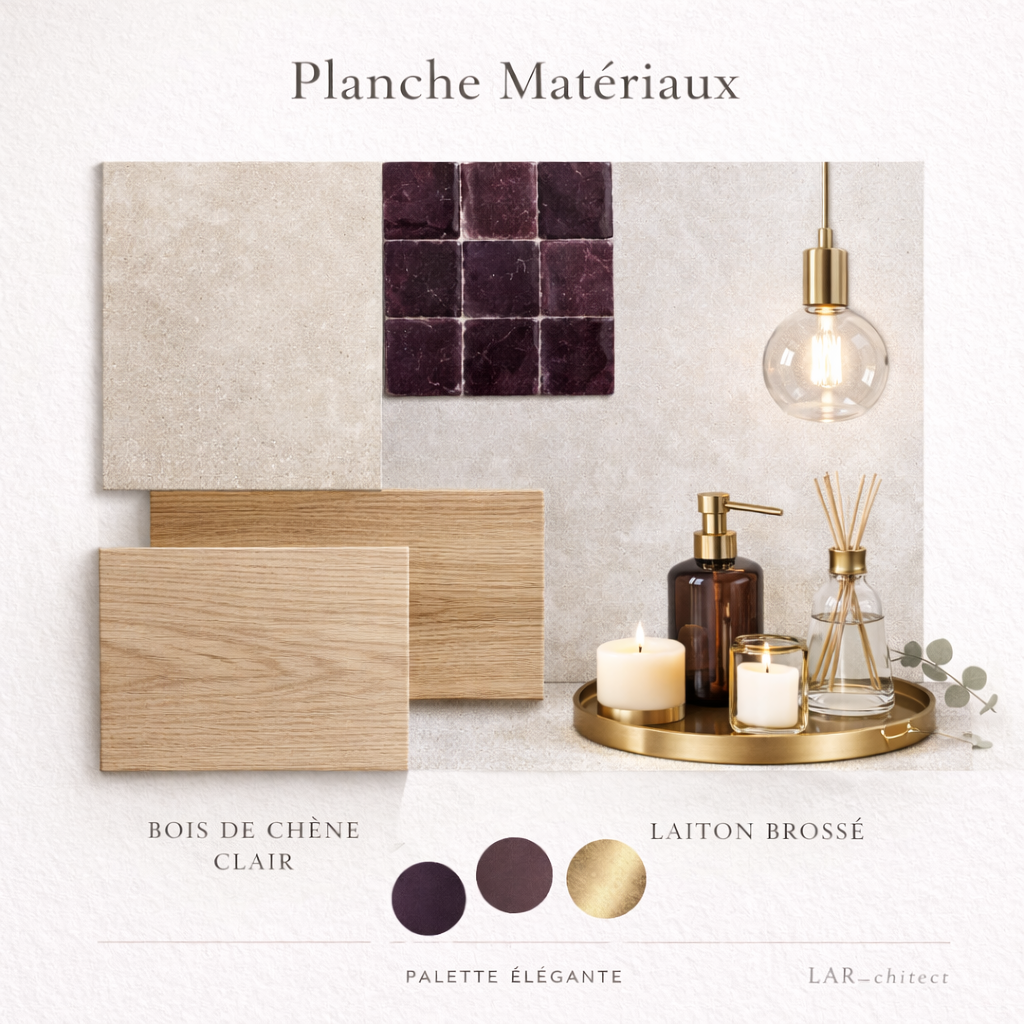 Dans la salle de bain, le projet joue la carte du contraste : un minéral clair en fond, contrebalancé par des façades aubergine profondes. L’ombre et la lumière dialoguent, et la palette gagne en profondeur grâce à des détails en laiton brossé.