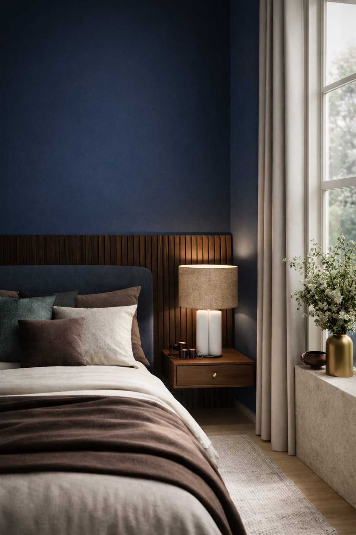 La suite parentale développe une palette bleu profond assumée, pensée pour créer un espace enveloppant et apaisant. Ce bleu est structuré par un soubassement en bois vertical : un choix fort qui apporte chaleur, relief et élégance.